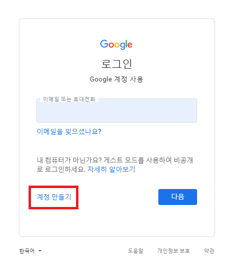 모바일에서 구글 계정 만들기는 PC 하고 동일합니다.